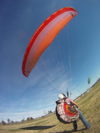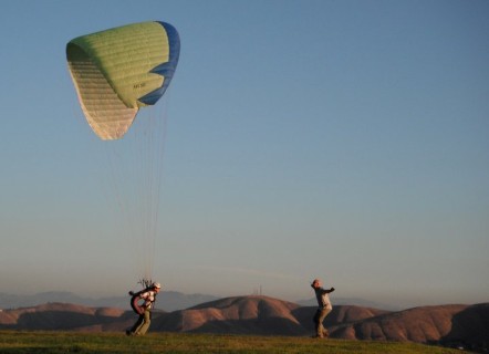The day lesson is the best way to try paragliding out with no commitment required. All your gear will be supplied for the day and all you need to do is show up ready to learn and have fun. We will spend some time learning some theory and safety about paragliding and quickly get you setup on your own gear for the day. The order of the day is to learn 1 of 2 different launches to the point where you have the wing under enough control to launch from a small training hill. You can expect to get several training flights with heights from 5't to 30' off the ground. All the important points of launching, flying and landing will be covered so that you can execute all of these safely and easily. You will be under supervision from the instructor the entire time as well as hooked up with a radio so that the entire training flight can be monitored and coached to ensure safety.